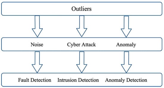 IoT remains a significant challenge. One technique that effectively analyses the collected data stream is anomaly detection [5,6]. These unexplained phenomena could be outliers, anomalies, cyber-attack, novelties, exceptions, deviations, surprises, or noise [7,8], where outliers are the data points that are considered out of the ordinary. Detection of these points can be done using outlier detection methods [9]. The anomalies are a special kind of outlier that has actionable pieces of information which could be meaningful. To detect these points, anomaly detection methods are used [10]. Similarly, fault detection is used to detect noise, which is unwanted, and wrong data that has to be removed [11]. Cyber attacks, on the other hand, are more sophisticated; they can be hidden between the data points and hard to detect [12]. Figure 1 illustrates the difference between the above-mentioned terms.