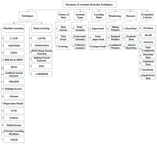- Taxonomy that defines current literature based on the nature of the data, anomaly types, detection learning modes, window model, dataset, and evaluation criteria;
