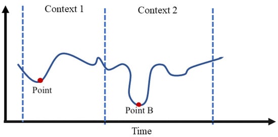 Another type of anomaly is observed for any data pattern that occurs as usual and anomalous in one scenario. The detection of spatial anomalies includes comprehension of the meaning [19], which typically occurs inside time-series data sources. A common example is heavy traffic jams during rush hour, which may be a contextually anomalous traffic activity after midnight because of a crash, poor visibility, or other causes related to foggy conditions. An example of contextual anomaly is shown in Figure 4.