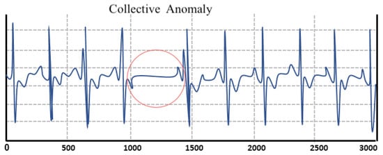 A series of observations is evaluated to recognize collective anomaly behavior. Any variance from the usual pattern may result in collective anomalies over consecutive time intervals concerning complete data patterns [19]. For example, a single time interval calculation is not enough to evaluate the operation of the heart, whereas cumulative signals can determine usual or anomalous behavior, as illustrated in Figure 5.