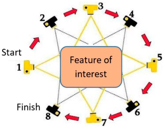 The SfM method, belonging to the passive data acquisition technology, allows to create digital 3D models based on many two-dimensional images (photos). To generate a three-dimensional model, one needs a series of images of an area or object with a large overlap (about 80%), taken at different angles and at different distances, Figure 1 [41]. An average quality camera is sufficient to take pictures, and now even a camera built into a smartphone, making this method a low-cost solution. The smartphone is considered a device of common use, because its price in relation to the many different possibilities it offers to each owner is relatively low.