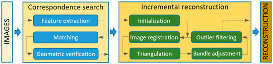 The general process of incremental SfM operations is shown in Figure 2 [44]. It can be broken down into two main modules: correspondence search and incremental reconstruction. The first module aims to search for complete and diffuse matches specific to two images. It has three sub-steps: feature extraction, feature matching, and geometric verification. The second module aims to estimate the alignment of images and three-dimensional scene points. It is possible thanks to the following steps: initialisation (selection of the best pair of images), image registration (for orientation), triangulation (calculation of 3D points), adjustment of the beam (local and global improvement) and removal of outliers.