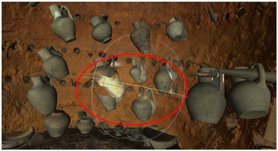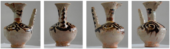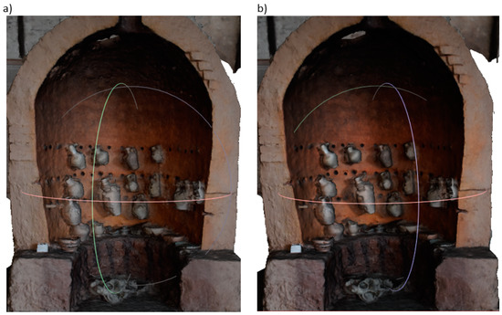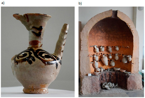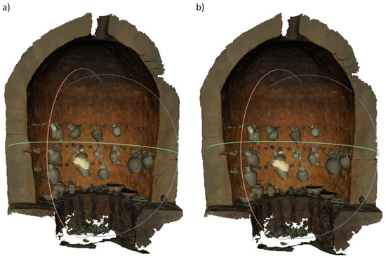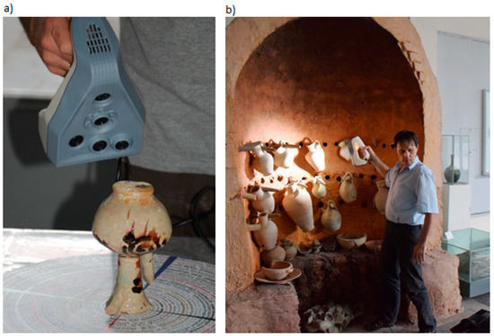 The Afrasiyab museum has exhibits from the city’s excavation site. A trading city on the Silk Road, Samarkand was known from the 5th century BC, and was destroyed in 1220 by the invasion of Genghis Khan [46]. Currently, excavation sites covering an area of nearly 200 hectares are located within the administrative area of Samarkand (Uzbekistan). Selected exhibits from this museum have been described and presented using VR exposure [47]. Two very different objects were selected for the comparative analysis of digital three-dimensional models. The first object is a small glazed jug from the turn of the 11th–12th centuries [48]. The shape of the jug is typical of this period and region of origin, it is only 14.1 cm high and 8.9 cm in diameter. A characteristic feature of the jug is a long narrow funnel and a handle placed on the opposite side, of which, in this example, only the upper part of Figure 3a has been preserved. The second object is a reconstructed pottery kiln, 276 cm high, 219 cm wide and 110 cm deep. This object stands against the wall of the exhibition hall and is only accessible from the front, Figure 3b. To make its interior visible, a longitudinal section of the entire facility was made, and for exhibition purposes, jugs of various types and sizes were hung in several rows on the furnace wall, and several bowls and plates were placed inside.