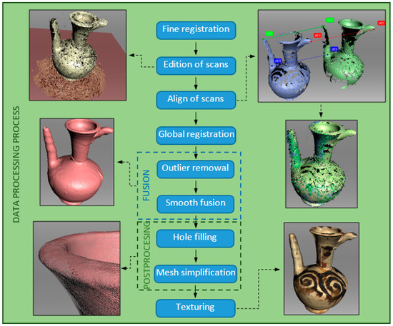 Artec Studio software version 15 Professional and a computer equipped with an Intel Core i7 (3.4 GHz) processor, 64 GB RAM and an NVIDIA GeForce GTX 1080 graphics card with 8 GB internal memory were used to process the data obtained in the process of scanning the jug and stove. The stages of data processing in the form of 3D SLS point clouds on the example of a jug are shown in Figure 5.