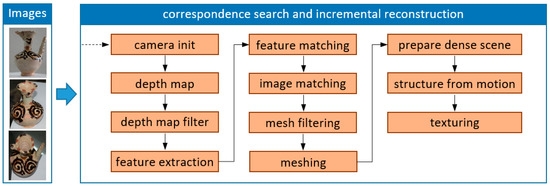 The data processing (2D photographic images of the jug and the oven) to create three-dimensional mesh models and textures was carried out using the free Meshroom [42,43] v2020.1.1 version available under open-source license. The works were carried out on the same computer equipment as for the 3D SLS method. The steps of the data processing on the example of a jug are shown in Figure 6.
