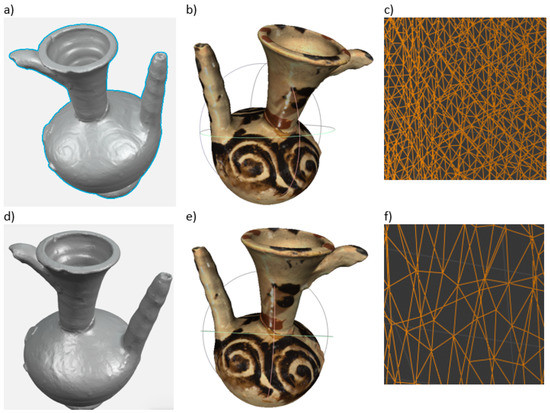 Due to the large number of vertices and faces in the model grid and the large size of the .obj file (Table 4), the mesh was reduced using the free Blender program. For this purpose, the Decimate tool was used, which allows to change the coordinates of the vertices, and thus the walls, in relation to the original model. The Decimate tool permits one to modify the mesh of the model using one of the methods: Collapse, Un-Subdivide and Planar. Based on the experience gained earlier, the authors used the Collapse method. The actions performed led to a tenfold reduction of the model mesh, resulting in 21,488 vertices and 42,972 faces (Figure 7c,f). This resulted in the size of the .obj file being reduced to 4.31 MB. The texture has also been changed from 4096 × 4096 px to 2048 × 2048 px. The file size after .jpg optimisation was 953 kB. Despite the use of such large simplifications, they did not significantly deteriorate the quality of the model and its texture. It is true that there is no spiral in Figure 7d, which is visible in the base drawing (Figure 7a), but after applying the texture, the differences between the drawings are generally not visible (Figure 7b,e), and it is the 3D models covered with textures which are presented in virtual museums.