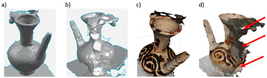 After 49 photos were uploaded to Meshroom and verified by the software, only 28 photos were qualified for further analysis. After performing all steps of the procedure, the mesh model with the applied texture was obtained. The model was exported to a .obj file and the texture to a .jpg file. The appearance of the digital 3D model obtained from the original photos (untreated) is shown in Figure 9. It is clearly visible that on one side of the model the geometric surfaces and the texture were very well recreated (Figure 9a,c). This can be seen on the surface of the spout, neck and body of the jug. The edges of the spout are even and not jagged. On the other side of the model, however, there are many surface discontinuities, the mesh is heavily deformed (no smoothing, there are many outliers from the background of the photos, as shown by the arrows in Figure 9d). Outliers have been incorporated into the mesh causing additional distortions of the geometric surfaces of the model.