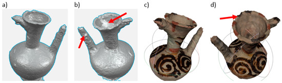 In this case, after loading 49 photos into Meshroom, only eight of them were rejected. Thus, the process of creating a 3D model was carried out using 41 photos. The obtained mesh model is shown in Figure 11. It is not difficult to notice that the obtained three-dimensional mesh model of the jug was significantly improved, all sides of the object were correctly recreated. Only some surface irregularities appeared on the spout and the walls of the neck and funnel (as shown by arrows in Figure 11b,d).