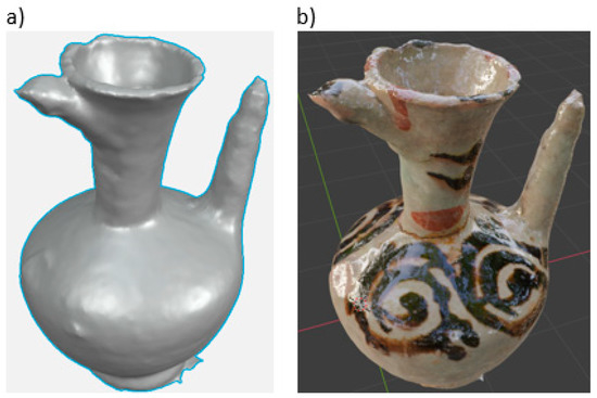 The appearance of the digital 3D model of the jug obtained by the SfM method after smoothing the surface: (a) without texture, (b) with texture.
