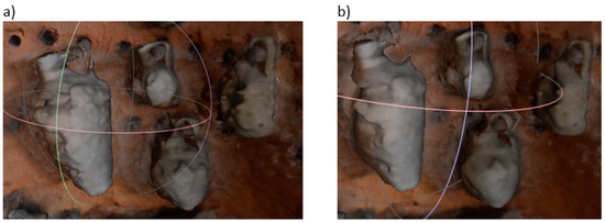 When scanning the jug (Artec Spider), three scans were made at different positions of the object on a manually rotated table covered with a special texture ensuring proper positioning of subsequent points of the surface taken from the object (Figure 4a). The resulting files containing all point clouds and object texture information were 1.12 GB in size. Information on individual scans is presented in Table 3.