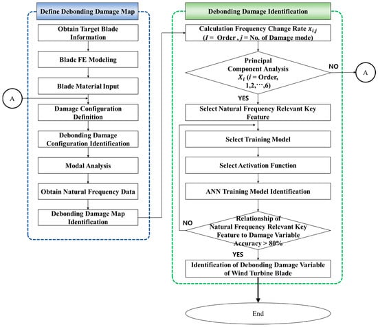 This study developed and demonstrated a procedure for identifying debonding damage using an ANN on the changes in the natural frequency characteristics of a wind turbine blade, as shown in Figure 1. The procedure consists of (1) selecting the target blade and constructing a corresponding FE model, (2) defining the debonding damage configuration through selecting proper debonding damage variables, (3) constructing a debonding damage map using the natural frequency changes obtained through modal analysis, (4) selecting important key features using a preprocessing technique such as PCA, and (5) identifying debonding damage using an ANN. In this study, the authors employed the blades of the 5-MW class Sandia offshore wind turbine [].