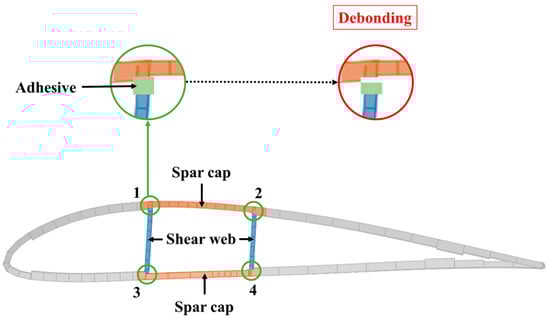Wind turbine blades generate electrical energy by using the lift and drag of passing wind to rotate a structure connected to a generator shaft. The blade is composed of upper and lower skins that receive the wind energy, and a spar cap-shear web that increase the load resistance of, and prevent damage to, the skin [,]. To address the resulting increase in the weight of the blade’s structure, wind turbine components are generally manufactured using glass- and/or carbon-fiber-reinforced composites with high specific strengths and stiffnesses [,]. When these composite structures are connected, mechanical bonding methods such as riveting or bolting may not only increase weight but also the stress concentration and resulting premature failure. Therefore, an adhesive-based bonding method is used to make the connections between these composite structures []. Unfortunately, adhesive-based joints have a high likelihood of developing debonding damage that separates the joints between members due to defects or unconsidered factors in the design and manufacturing process, potentially causing the catastrophic failure of the wind turbine [,]. In particular, the joint between the spar cap-shear web, which supports the entire load applied to the blade, is considered to be an early and dominant failure site that can lead to significant damage [,,]. It is therefore important to have a methodology to identify possible debonding damage in advance of premature failure at the joints between the blade spar cap-shear web.