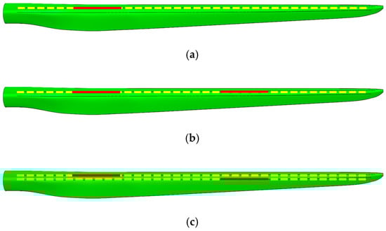 In particular, to model debonding damage at the spar cap-shear web joints, the multi-point constraint (MPC) technique was applied to prevent stress concentrations and consider the joints’ structural behavior []. In addition, although there are numerous configurations of damage that can occur in blades composed of skin, a spar cap, and a shear web, a limited set of governing variables were selected in the study to realize a more efficient and less time-consuming analysis. As shown in Figure 3, the debonding damage configurations were defined by varying the single/multiple damages, start location, and length of debonding damage at the specific joint. The natural frequencies for each of these damage configurations were then obtained by performing modal analysis.
