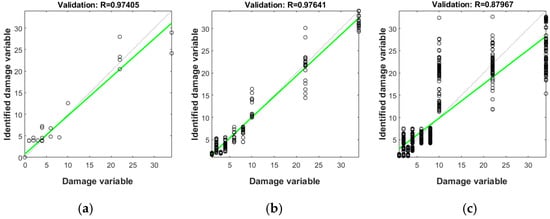 The analysis results showed an overall damage identification accuracy of 84%, as shown in Figure 8. Here, the x-axis represents the predefined debonding damage variables for 1105 sets of debonding damage configurations defined for training and the y-axis represents the identified debonding damage variables obtained through the proposed ANN-based damage identification model. Here, the dotted line indicates the reference line of R = 1.0 and the solid line shows the regression line for the identification results by the ANN-based damage identification model. These results show that the proposed ANN-based damage identification model has a high accuracy of about 84%.
