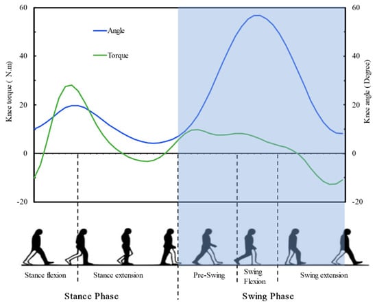 The main purpose of the prosthetic knee is to restore the motor function of the amputated knee by mimicking the behavior of the biological knee. Figure 1 shows the knee angle and torque curve of a normal person during a gait cycle. In this figure, the stride cycle begins and ends when the heel strikes the ground. As shown in the figure, toe off the ground occurs approximately 62% of the stride period. The initial flexion and extension of the knee joint keeps the center of gravity of the body relatively vertical and horizontal. The net power during the swing phase is basically negative, but the positive power output of the prosthesis is needed during the stance extension phase of the natural gait. The positive power output occurs in about 14% to 30% of the gait cycle, whereas the active torque cannot be provided by mechanical passive or variable damping prosthetic knee.