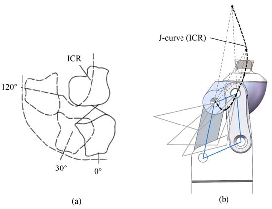 The biological structure of the human knee joint is shown in Figure 2a. It consists of medial and lateral femoral condyle, tibial plateau, patella, anteriorly crossed ACL ligament, and PCL ligament. The shape of the contact surface between the lower end of femur and the upper end of tibia is irregular, and there is rolling and sliding between the two surfaces during flexion and extension. The trajectory of the curvature center of the horizontal rotation axis of the knee (Instantaneous Centre of Rotation (ICR)) is a J-shaped curve. The rotation center of single axial prosthetic knees cannot simulate the motion of the natural knee. In normal walking, the feet and the ground need a certain gap to avoid collision. To maintain this distance, many patients have to tilt their body during the swing phase, allowing the prosthesis to draw an arc on the horizontal plane. There is a tendency for prostheses to be shorter than healthy human legs when assembled with transfemoral amputees, and these methods not only affect the symmetry of the human gait but also have a significant impact on the stability of the human body. To solve this problem, the prosthetic knee joint designed in this paper adopts a four-bar mechanism. Due to the change of the ICR of the four-bar mechanism, the effective leg length of the prosthetic limb is shortened when the knee joint is bent, as shown in Figure 2b. Thus, amputees with intelligent bionic legs improve stability when walking on uneven surfaces, ramps, or stairs. The instantaneous center trajectory of the knee joint was the optimization objective; the multiaxis knee joint structure was optimized by using the multivariable optimization design method. The structural characteristics of the multiaxis knee joint, the swing angle range of the knee, and the requirements of the flexibility in the swing period were considered. The J-curve motion, which was the same with biological knee, was realized by the four-bar mechanism.