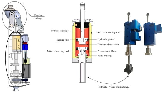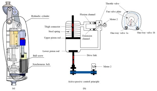 The active and passive structures of the prosthetic knee are shown in Figure 3. The thigh connector is connected to thigh socket in the upper side. The lower side is connected with the four-bar linkage. The upper piston rod is connected with the four-bar linkage by a drive link. For the variable damping control, the provided hydraulic system (Figure 3b) had one fan rotation valve, namely designed throttle valve, to generate joint resistance for the flexion and the extension movement. The position of the fan valve plate was controlled by the motor 1. The flow resistance could be continuously adjusted from low to high values by the rotation of the fan valve plate. When the piston rod moved down during knee flexion, the oil flowed through the throttle valve and one-way valve 1a in the flexion channel. The oil could not flow through the extension channel due to the unidirectional cutoff characteristic of the one-way valve 1b. The knee flexion damping could be regulated by the position change of the fan valve plate. The steel spring was stretched during knee flexion by the displacement of the upper piston. For the knee extension, the piston rod moved up and the oil flowed through the throttle valve and one-way valve 1b in the extension channel. The oil could not flow through the flexion channel due to the unidirectional cutoff characteristic of the one-way valve 1a. The knee extension damping was also adjusted by the position change of the fan valve plate. The energy stored by stretch of steel spring was released. This could provide assistance for knee extension. For the powered mode, the throttle valve is completely open. This means the passive hydraulic damping is free. The lower piston rod is driven by the ball screw. The vertical displacement of the ball screw is controlled by the synchronous belt connected to the motor 2. When the lower piston moved up, the upper piston was pushed up and the active knee torque was provided by the four-bar linkage. A hole exists on the lower piston rod to ensure that the oil flow is not affected by the up and down motion of the lower piston rod. The detailed structure of the hydraulic system and the prototype are shown in Figure 4.