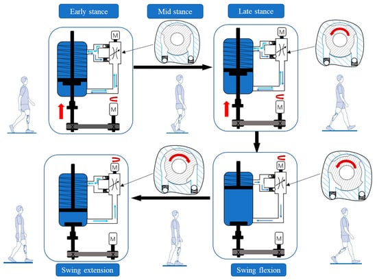 The work scheme of the semi-active prosthetic knee is shown in Figure 5. At the beginning of stance in the human gait, the heel touches the ground. The calf quadriceps need to concentric contraction to increase the center of gravity and prevent the lateral foot in the swing phase from touching the ground. The knee joint provides positive work. We connect the motor 2 with the synchronous belt to output the active torque and transfer it to the ball screw. The transmitted torque of the ball screw is controlled by adjusting the speed of the motor 2. Therefore, the torque needed by the human body to do positive work is outputted by the motor 2. When the knee joint enters the swing flexion phase, the side leg touches the ground and the hip joint begins to flex. At this time, the hydraulic damping cylinder works. The pressure between the upper and lower oil chambers of the hydraulic cylinder is changed by the position change of the fan valve plate. The real-time damping torque was provided by this operation. During the swing extension phase, the extension damping torque was provided to slow the foot movement to the initial velocity of contact with the ground. Due to the fact that the prototype is currently in the processing state, the sensor system is not completely determined. In terms of control, the design mentioned in this paper will mainly use angle sensor, IMU, and force sensor to identify the gait cycle and control the position of the rotating valve. The sensor system can consider our previous work [].