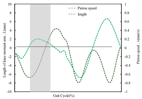 The ADAMS software was used to conduct the simulation. The parameters and values of the hydraulic cylinder are shown in Figure 7 and Table 1. To obtain the torque provided by the prosthetic knee, the piston velocity V and arm L in a gait cycle should be calculated by simulation firstly. The angular velocity curve of the knee joint in the normal gait [] was transformed into spline curve to add driving force to the prosthetic knee for motion simulation. The velocity curve of the upper piston in the prosthetic knee joint, V (mm/s), and the real-time moment arm L (mm) of the prosthetic knee joint were obtained, as shown in Figure 8. The piston rod speed was smooth and the length change of the knee moment arm was in the range. The torque simulation process in the ADAMS and human body parameters setting are shown in Figure 9 and Table 2.