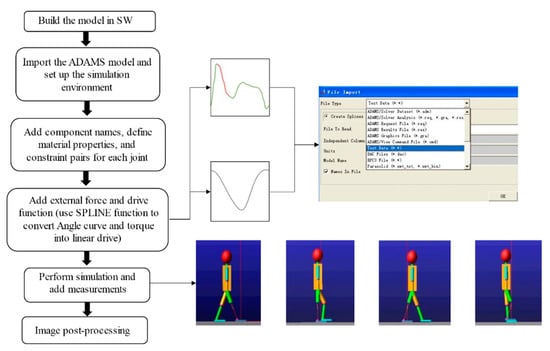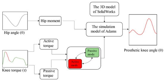 The knee angle was also obtained by simulation. The knee angle acquirement scheme is shown in Figure 11. The equivalent model was established in Adams (MSC software). The normalized hip angle (θ) and the prosthetic knee torque obtained by simulation were set as the driving source in the Adams simulation environment. The active torque and passive torque provide corresponding drivers for simulation model in the active and passive stages in the gait cycle, respectively.