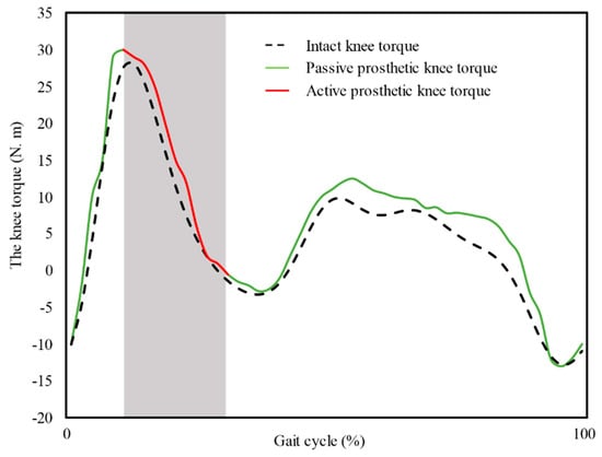Combined with MATLAB software solution and the mathematical model, the torque provided by the prosthetic knee was calculated (Figure 10). The active torque and passive torque could be provided alternately. The active phase is about from 15% to 30% and the other is passive phase. The work mode was similar to the normal knee joint. The symmetry indices data calculated of the knee torque are shown in Table 3. The number values of SI were smaller than 10% in the whole gait. The knee torque symmetry of swing phase was higher than the stance phase. The dominance was prosthetic knee in stance phase while it was the intact knee in swing phase. It means the active torque and hydraulic damping can simulate the active-passive working principle of the biological knee.