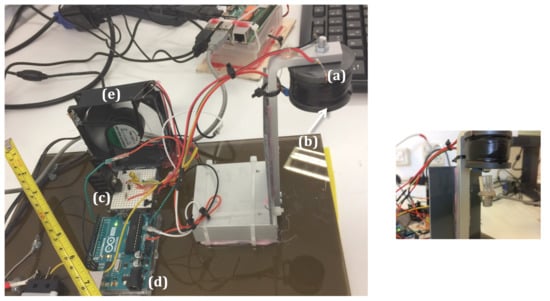 A low-cost experimental platform for electromagnetic levitation control design. Main parts (left): (a) actuator coil; (b) Hall-effect sensor; (c) power amplifier; (d) Arduino Uno microcontroller; and (e) a fan to dissipate heat from the power amplifier. (Right): Photo of the object being levitated.