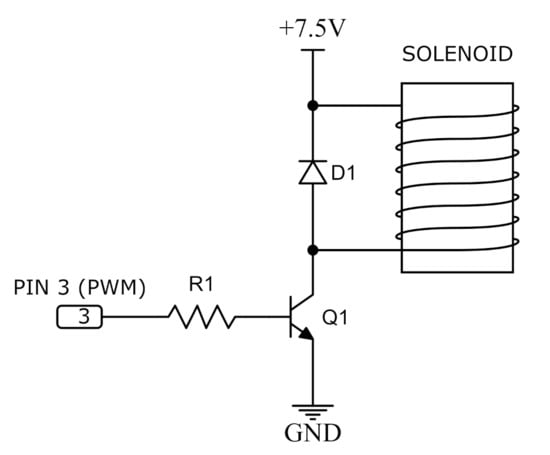 Power amplifier circuit. The PIN 3 of the Arduino Uno generates a PWM signal that drives the transistor Q1 into either ‘on’ or ‘off’, like a switch, thus controlling the current that flows through the solenoid coil accordingly. The components used are a resistance of R1 = 580 , a diode D1 with a forward voltage drop of 450 mV and a forward current of 1 A, and transistor Q1 (code NTD4858N 25 V 73 A).