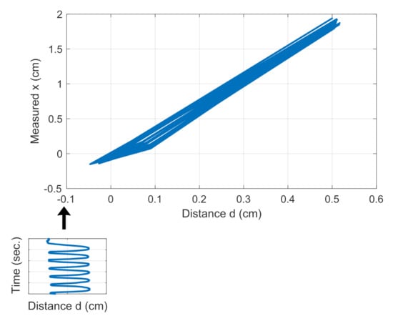 - The electromagnet can produce hysteresis, a phenomenon documented in the literature [] (Ch. 1.6). Moreover, the Hall-effect sensor may become inaccurate due to the corresponding hysteresis []. In this case, the sensor measures an unreal distance d, depending on whether the object moves in the sensor’s direction or not—Figure 6 illustrates this phenomenon through experimental data. Additionally, the Hall-effect sensor is sensitive to the magnetic field generated by nearby electrical wires.Figure 6. Hall-effect sensor showing hysteresis. The real-time distance, measured by the Hall-effect sensor, differs from the distance d measured by other calibrated measurement device.