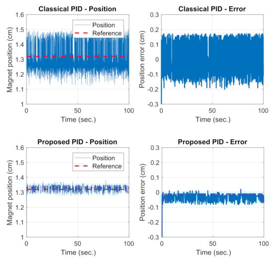 Table 2 shows the nominal and empirically optimized control parameters for both controllers, (7) and (8). As shown in Table 3, the proposed control strategy in (8) outperforms the classical PID control. The data are also illustrated in Figure 7 and Figure 8. A visual inspection confirms that the control (8) greatly diminishes the error of the object’s position when compared to the error produced by the classical PID control. This finding represents a contribution of (8) in controlling the MagLev.