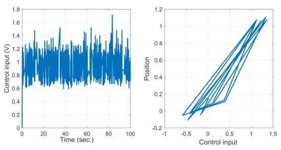 It was observed in the laboratory that hysteresis was the main difficulty to achieve the levitation, despite the control method. It is well known that the magnetic flux does not disappear completely, as the electromagnetic core still retains some of its magnetism, even when the current has stopped flowing in the coil [] (Ch. 1.6). Moving the input signal to the linear region of the hysteretic loop by adding a constant DC current is the simplest method to solve this problem, but with the disadvantage of adding noise, see []. Thus, the input voltage must be modified by a constant in (5) and (6) to diminish the hysteresis produced by the electromagnet []. Thus, the real implemented control is and defined as