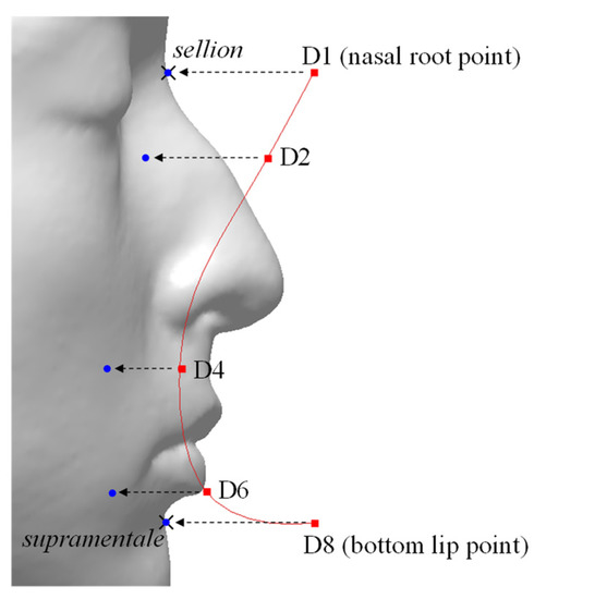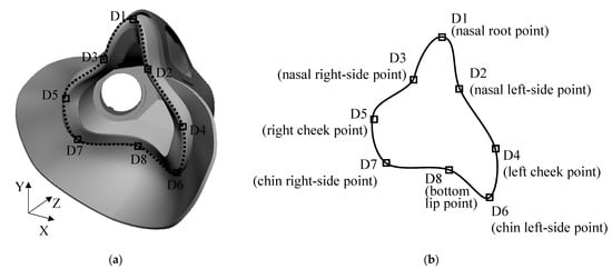 As shown in Figure 1, the gourd-shaped part of the mask contacting the face is designed by forming a line connecting design landmarks on the mask using spline interpolation. The mask design landmarks are defined as points that form the mask boundary using a spline curve [15,31]. The locations of the design landmarks are determined by considering the shape of facial features such as the root and sides of the nose and the sides and bottom of the lip for a natural fit of the mask boundary to the face. For example, as shown in Figure 1, the boundary of the existing MBU-20/P pilot oxygen mask proposed by Gross et al. [15] is drawn by connecting eight design landmarks: a nasal root point (D1), two nasal side points (D2 and D3), two cheek points (D4 and D5), two chin side points (D6 and D7), and a bottom lip point (D8). Note that the mask boundary can be modified by adjusting the locations of the design landmarks or adding/removing design landmarks.