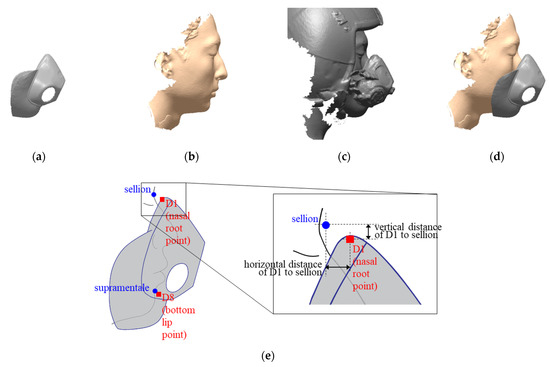 The wearing positions of a pilot oxygen mask on the face are identified using 3D scan images of the mask and the face and the information of the mask design landmarks and facial landmarks, as illustrated in Figure 2. The mask, face, and face worn with the mask are scanned separately (Figure 2a–c), and then the individual scan images of the mask and face are overlaid to that of the mask-worn face (Figure 2d). This superposition approach is conducted by referring to the previous studies on the virtual alignment of a product on a particular human body part [15,32]. Lastly, the wearing positions of the mask on the face are identified by measuring the vertical and horizontal distances between the mask design landmarks such as D1 (nasal root point) and D8 (bottom lip point) and the facial landmarks such as sellion and supramentale (Figure 2e). The quantitative data (average, SD, and range) of the mask-wearing positions are used for the placement of a 3D mask design model to a 3D face scan image in the virtual fit analysis of a mask design. The mask-wearing position information is important for the analysis of distances between a particular mask design and various faces while applying the same placement strategy of the mask to the faces.