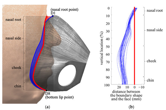 A virtual fit analysis method is developed to find the most ergonomically optimized boundary of the mask by virtually fitting the mask to various 3D faces. First, the boundary of a mask is virtually located over a 3D face at the identified mask-wearing positions. After virtual fitting of the mask to the face, the horizontal distances between the boundary of the mask and the surface of the 3D face are calculated along the vertical axis with an interval of 1% of the mask length, as illustrated in Figure 3a; in the plot, the facial area of which horizontal distance <0 mm (red area in Figure 3a) indicates the mask boundary region not contacting the face (causing oxygen leakage), while the opposite penetrating the face (causing contact pressure to the face). Next, the interface area of the mask and the face is divided into five sections along with the vertical location from the top: 0% to 10% for the nasal root area, 10% to 50% for the nasal side area, 50% to 90% for the cheek area, and 90% to 100% for the chin area. Figure 3b plots the horizontal distances of a designated group of faces (e.g., n = 29 pilot faces belonging to the small narrow size group) from the mask boundary, showing negative horizontal distances at the nasal root and positive horizontal distances at the other face sections. A virtual fit analysis program was coded using MATLAB (MathWorks, Inc., Natick, MA, USA) in the present study to analyze horizontal distances between the mask boundary and 3D face surfaces.