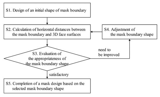 An ergonomically optimized shape of the mask boundary for a designated user group is searched by an iterative design process and virtual fit analysis shown in Figure 4. In the first step (S1), an initial shape of the mask boundary is prepared by generating a spline curve that connects the design landmarks corresponding with positions on the face with the average size for the user group. In the second step (S2), the horizontal distances between the mask boundary and 3D face surfaces of the user group are calculated. In the third step (S3), the plots of the horizontal distances are evaluated to determine the appropriateness of the mask boundary for the designated user group. Note that the present study used a range of proper fit along the face sections identified by a usability evaluation survey of the MBU-20/P oxygen mask (described in Section 3.2) to evaluate the appropriateness of a mask boundary. In the fourth step (S4), the mask boundary is modified by adjusting the locations of the design landmarks in case that the mask boundary is found unsatisfactory for the designated user group. Repeat S2 to S4 until a satisfactory mask boundary is found. Lastly, in the fifth step (S5), a complete design of the mask is developed based on the selected mask boundary.
