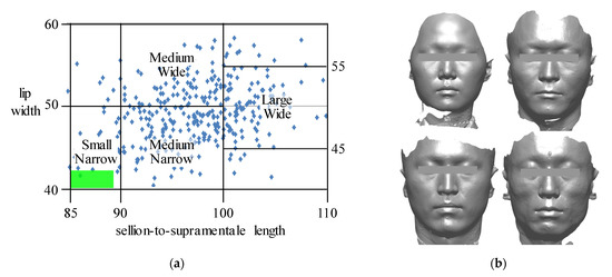 Three-dimensional (3D) scan images of 336 KAF pilots and cadets (278 males and 58 females) obtained in our previous study [1] were used to improve the existing oxygen mask design in the present study. The 3D scan images of pilots were collected using the 3D scanner Rexcan 560 (Solutionix Co., Seoul, South Korea) and then eighteen facial dimensions were measured. Four mask size groups and pilots belonging to each size group (small narrow: 34, medium narrow: 121, medium wide: 76, and large wide: 105) were identified by applying a sizing system generation method [33,34,35] based on sellion-to-supramentale length and lip width (key facial dimensions of MBU-20/P) as shown in Figure 5a and four representative face models (RFMs) were found for each size group as shown in Figure 5b [35]. Of the KAF pilots and cadets, the profiles of 85 male pilots (small narrow: 21, medium narrow: 23, medium wide: 19, and large wide: 22) were photographed while wearing their current oxygen masks to examine the mask-wearing positions.