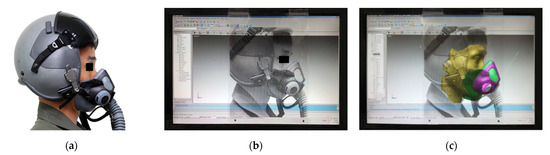 A photo-based placement of the 3D face and mask images for the identification of mask-wearing positions (illustrated). (a) A profile photo of a pilot while wearing the MBU-20/P oxygen mask; (b) a transparent film with a printed photo placed on the monitor; (c) an alignment of the 3D face and mask images to their corresponding images of the printed photo on the film.