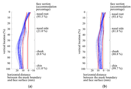 Virtual fit analysis results of the existing and alternative designs of pilot oxygen mask boundary (size: small narrow; red lines: the lower and upper limits of appropriate fit; blue lines: plots of the horizontal distances between the mask boundary and face surfaces). (a) Existing design; (b) alternative design.