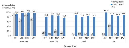 The accommodation percentages of the revised mask boundaries derived through the virtual fit analysis method for the four sizing categories were found 4.8~88.7% higher than those of the existing boundary shapes over the face sections for KAF pilots. The accommodation percentages at the nasal side, cheek, and chin areas showed noticeable improvements for proper fit of the mask to the face (Figure 10). All the accommodation percentage differences between the existing and revised masks except two conditions (SN and MW at the nasal root) were found significant by the paired t−test at α = 0.05.