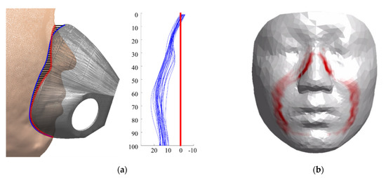 Virtual fit analysis by calculating horizontal distances between the mask boundary and 3D face surfaces (illustrated). (a) Horizontal distances between the mask boundary and the face surface along the vertical axis with an interval of 1% of the mask length (blue line: mask boundary; red line: face surface, red shaded area: mask boundary region of negative horizontal distances causing oxygen leakage; blue shaded area: mask boundary region of positive horizontal distances causing contact pressure to the face); (b) plots of the horizontal distances between the mask boundary and face surfaces of a small narrow size group (n = 29).