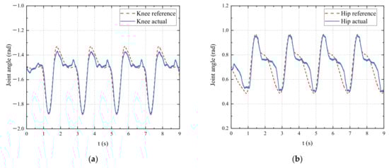 The robot is tested by performing an offline joint trajectory tracking task, in which we compare the general PID controller and the compound PID controller with velocity feedforward compensation as Figure 12 depicts. The PID gains and the velocity compensation gain are shown in Table 3. With the control of a single PID controller, the maximum tracking errors of the knee and hip angles are 0.092 rad and 0.122 rad in a gait cycle. However, when using the compound PID controller, the maximum tracking errors decrease to 0.056 rad and 0.035 rad, reduced by 39.13% and 71.31% respectively, which has obvious improvement. Furthermore, the comparison of mean and standard deviation (SD) of tracking errors are compared in Table 4.