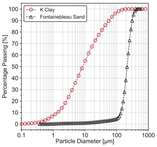 Fontainebleau sand NE34 was selected to prepare the sand–clay mixture samples, this is widely used in many geotechnical researches in the laboratory [7,8,9,13,61]. Fontainebleau sand NE34 is composed of 99% quartz [8,9,62]. The grain size distribution of the Fontainebleau sand is presented in Figure 1. It is characterized with a mean grain size (d50) of 0.21 mm, a coefficient of uniformity (Cu) of 1.72. The maximum and minimum void ratios of this sand are equal to 0.866 and 0.545, respectively [57].