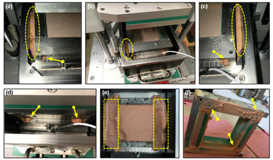 Improper sample preparation brings about soil specimen leakage from the space of the interface direct shear box: (a) leakage on the left of the shear box, (b) shear box and container, (c) leakage on the right of the shear box, (d) leakage in the front view, (e) soil sample without a good shape after dismantled and (f) soil leakage around upper part of the shear box.