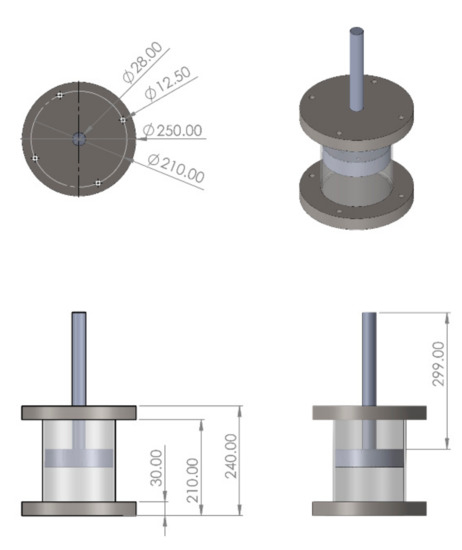 The oedometer test was first performed, then the specimen was trimmed and put into the direct shear device. In our case, it was not possible to use the sample with the same shape for both preconsolidation and interface tests, the sample should be trimmed to fit the interface direct shear box. The conventional cylindrical oedometer cell (with a diameter of 70 mm) is smaller than the squared interface shear box (100 mm × 100 mm). A new cylindrical cell was thus required, having a larger diameter than the diagonal of the shear box. A new oedometer cell was designed and manufactured for the sample preconsolidation, as shown in Figure 4. The designed oedometer cell consisted of a piston with small holes (7 mm in diameter), a cylindrical cell of stainless steel, two porous stone discs, a cap, and a base. These parts were fixed with some bolts after installation. The inside diameter of the cell was 150 mm, which is larger than the squared shear box diagonal (141.42 mm). The other details and dimensions of the designed preconsolidation cell can be referred to in Yin [57].