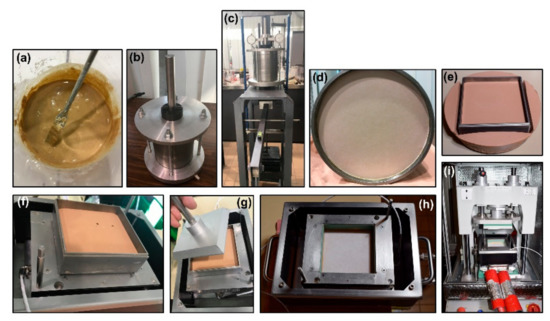 The procedure of preparing sand–clay mixture samples for interface direct shear tests: (a) slurry prepared by S1 mixing protocol, (b) installation of the sample into of the designed preconsolidation cell, (c) step preconsolidation on the oedometer frame, (d) uninstall the cell, (e) trimming the specimen with a cutter, (f) move to the shear box, (g) put the sample into the shear box with a rod, (h) after flatting put a filter paper and (i) move the shear box and container to the interface apparatus.