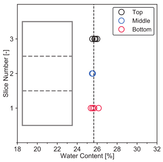 To check whether the water was homogeneously distributed inside the specimen, a sand–clay mixture sample with 75% clay content was prepared by the S1 protocol. The uniformity of the sample can be evaluated by the water content (w). After the S1 preconsolidation was finished, the sand–clay mixture sample was cut into three slices, i.e., bottom, middle, and upper slices. Each slice was cut into four parts, the water content of each part was measured, finally, there were four points of water content on each slice, see Figure 6.