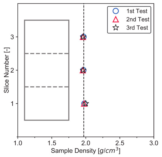 The uniformity of the S1 samples was also verified by the density (ρa) measurement in different slices from top to bottom. Three sand–clay mixture samples with 75% K clay were prepared by the S1 method. Figure 7 shows the density of each slice for the three samples. From the top to the bottom, the average density ranks as 1.96, 1.96, and 1.98 g/cm3, respectively. This small difference is attributed to the fact that the bottom zone of the sand–clay mixture specimen is consolidated more sufficiently due to a shorter path for water drainage. Moreover, the small difference (i.e., 0.02 g/cm3) indicates that the consolidation time (about 24 h for each loading step) is enough to obtain a uniform specimen.