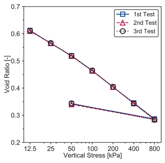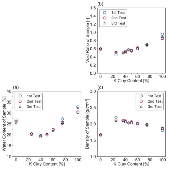After checking the water content and density in sand–clay mixture specimens of 75% K clay content, the average water content, void ratio, and density of the whole samples at different K clay contents (from 0% to 100%) were measured to check the repeatability of the sample preparation. The oedometer and interface direct shear tests were selected to further verify the ability of the S1 protocol for preparing identical sand–clay mixture samples. The K clay contents of the specimens for oedometer and interface direct shear tests were 50% and 75%, respectively.