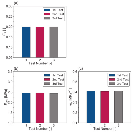 To evaluate the main characteristics of the mixtures’ compressibility in the 1D oedometer test, basic oedometric curves and parameters have to be delineated. The compressibility curves for the three specimens are shown in Figure 9. The initial void ratio after the sample mixed is not included, the data in Figure 9 starts from the vertical stress of 12.5 kPa. As can be seen, the three S1 samples show similar behavior; the values of the void ratio at each loading step are very close. The overall slopes of the three curves are nearly the same, and independent on the sample number. From the compressibility curves, the most important parameters can be calculated and analytical differences between the samples can be evaluated. The compression index Cc, the oedometer modulus Eoed and the coefficient of volume compressibility mv are calculated and outlined in a bar chart, as presented in Figure 10. The three S1 samples have similar values of the parameters and no significant differences can be observed among them. The results of the three samples are: 0.198 ± 0.001 for compression index Cc, 2.45 ± 0.01 MPa for the oedometer modulus Eoed, 0.409 ± 0.001 MPa−1 for the coefficient of volume compressibility mv.