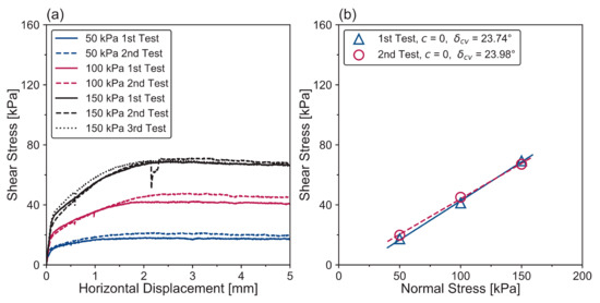 The curves at each normal stress overlap with each other at the beginning phase of the shearing (Figure 11a), which indicates that the samples have good repeatability. The different critical shear strengths are characterized with values of 2.43 kPa, 4.45 kPa, and 0.81 kPa (average value), at the normal stress of 50 kPa, 100 kPa, and 150 kPa. The difference among the critical shear strength is in good agreement with the previous publication [7]. The critical adhesion (c) and interface friction angles (δcv) of the first and second tests are shown in Figure 11b. Both the first and second tests are characterized with the same critical adhesion of zero (Figure 11b). The critical δcv for the 1st and 2nd interface direct shear tests are 23.74° and 23.98°, respectively, with a small difference of 0.24°. The shear stress curves, critical shear strength, critical adhesion, and interface friction angles of the interface direct shear tests demonstrate great repeatability of the samples generated by the S1 technique.
