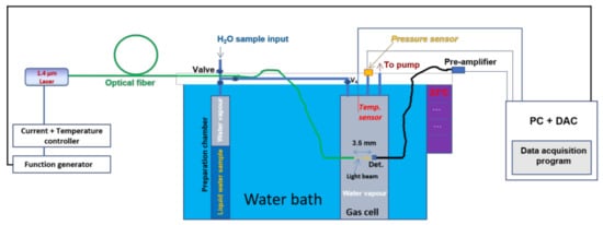 Figure 1 depicts the experimental setup employed in the H2O self-broadening measurements. The setup in Figure 1 consists of a dTDLAS spectrometer equipped with a DFB laser (manufacturer: NTT Electronics) emitting at about 1.37 µm, a water bath with a 14 L volume (whose temperature can be varied from 22–80 °C) and a stainless-steel gas cell with an optical path length of 3.5 mm. The water bath was used to ensure a high temperature stability of the gas cell, and by varying the water bath temperature, the gas temperature in the gas cell was also varied. The temperature stability of the water bath, at each temperature step, was found to be better than 90 mK (both horizontally and vertically).